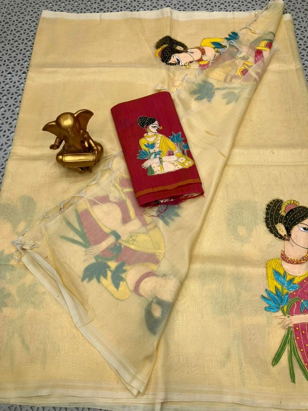 *Material*:Mangalagiri pattu by cotton *Model*:Mgl plain kantara hand painted pattu saree with extra raw silk blouse Running pallu and blouse