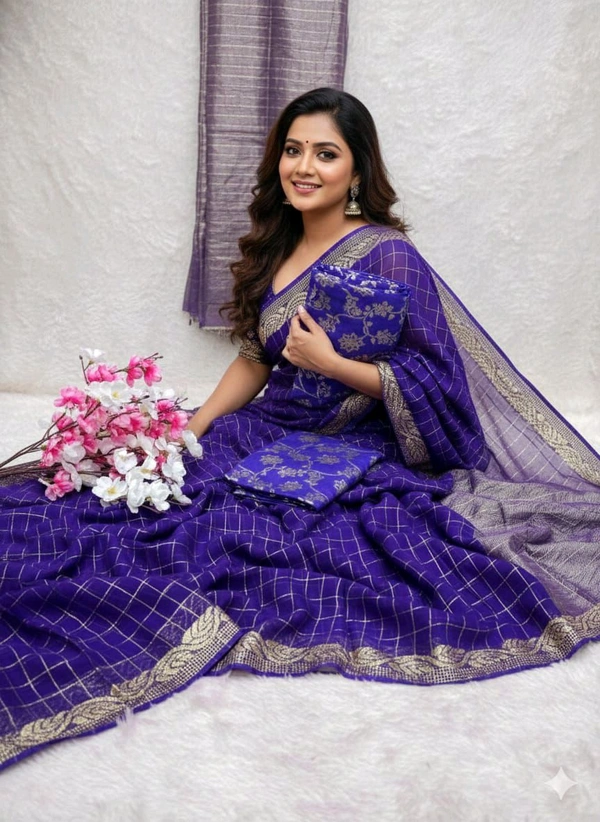 This saree is designed for women who appreciate quality and elegance. The Chinon viscose fabric offers a luxurious feel and a stunning drape, making it perfect for any occasion. Its lightweight texture ensures comfortable wear, while its vibrant design adds a touch of charm to your look.
